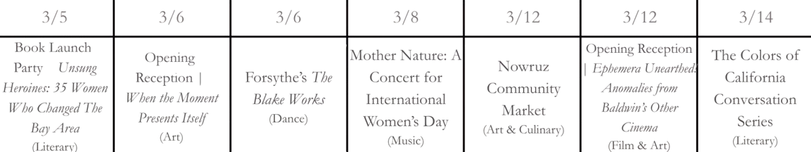 Why I Care: Community Women’s Orchestra is performing an all-female-composer program at First Presbyterian Church of Oakland for International Women’s Day. As one of the rare all-female orchestras in the US, the organization has spent over forty years building visibility and opportunity for women in classical music. The lineup spans centuries: from 19th-century firebrand Augusta Holmès to contemporary Berkeley-native Mattea Williams. Keep an eye out for my friend Kate, who’ll be playing 2nd trombone.